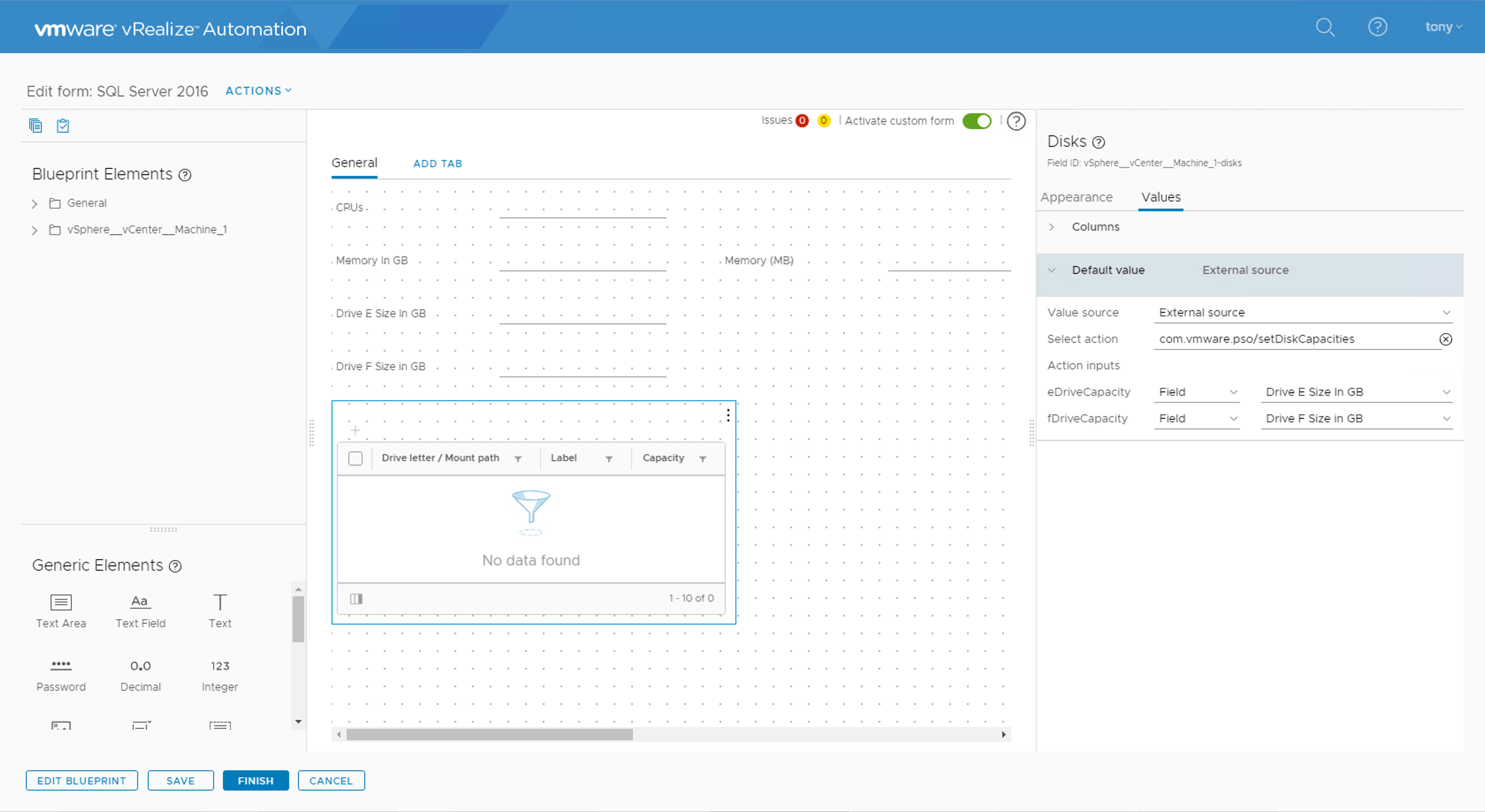 All disks used by the blueprint must also be included in the vRO action, even if their values will not change. If they are omitted the custom form will not load and provisioning would fail.
