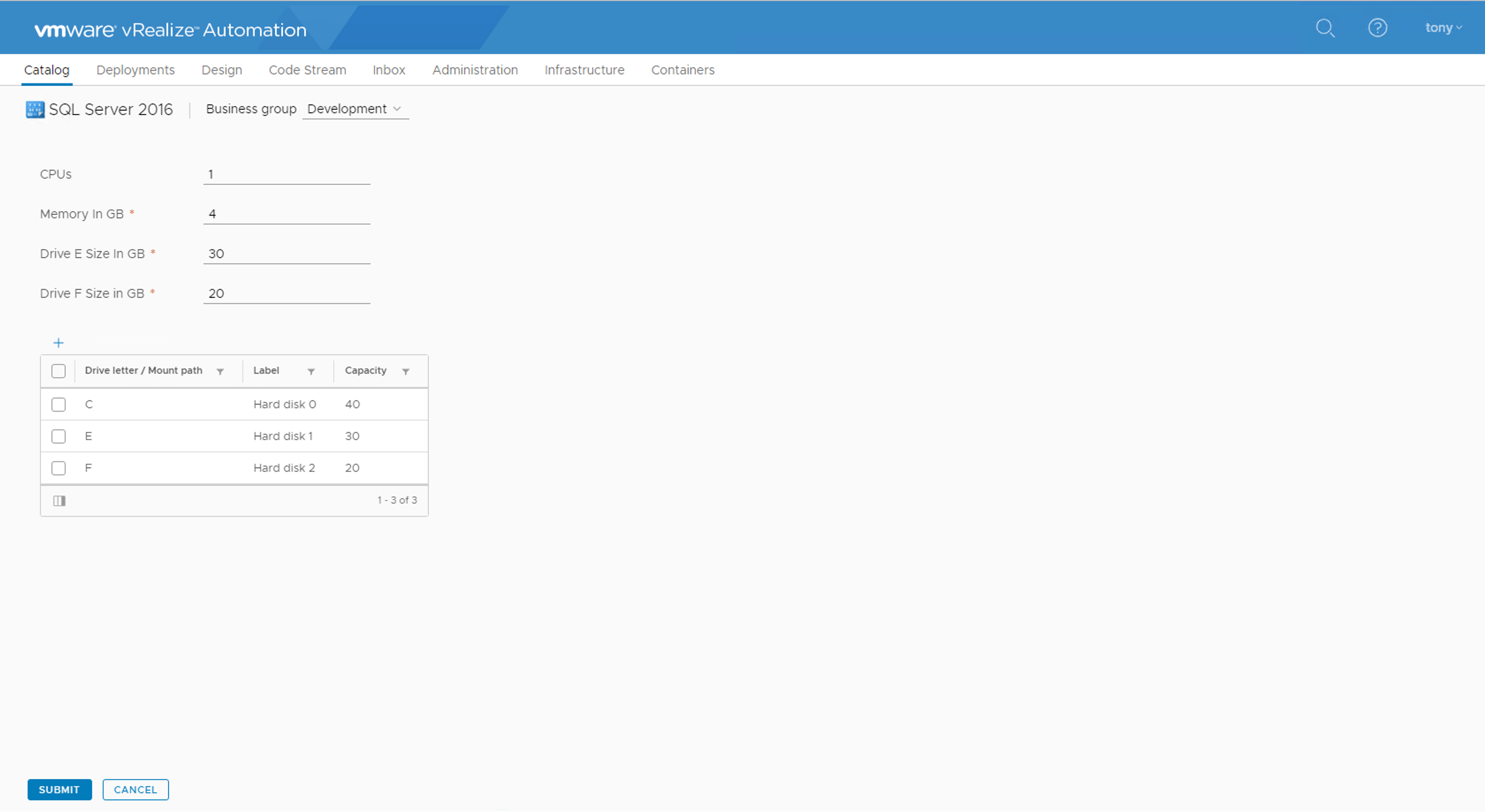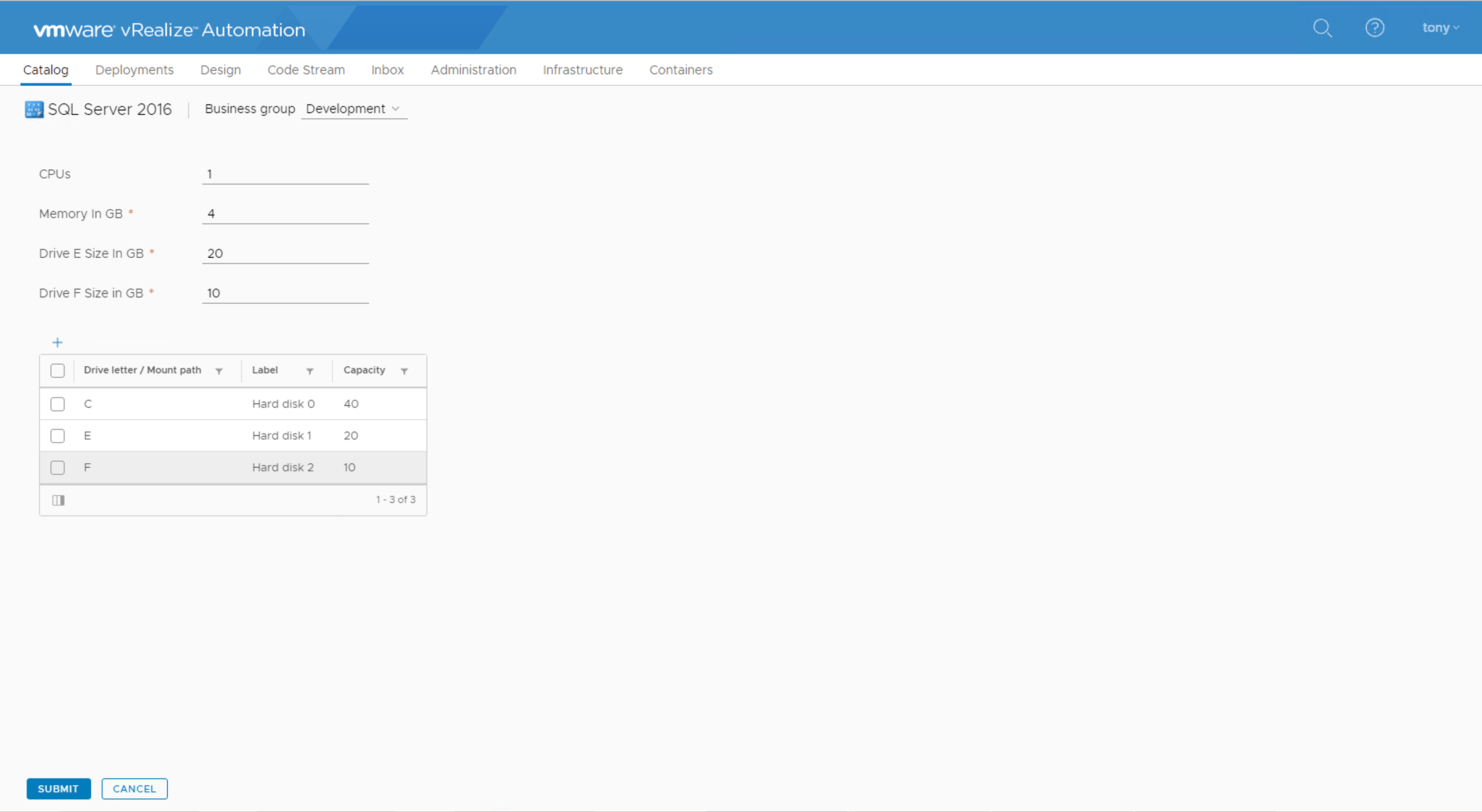 As outlined in Part 1, my customer asked to be able to remove or reconfigure the basic disks table that vRA provides on custom forms, such that users could change the entered disk sizes without having to see or change the other disk related properties. This scenerio was for a SQL Server catalog item, where the underlying vSphere template was shared between a Windows catalog item and a SQL Server catalog item. This meant it was not possible to specify the additional disks needed for SQL within the vSphere template. Also company policy was to allow different sizes of SQL Servers to be provisioned, there was no enforced standard disk sizes only a standard disk layout. This meant the disk sizes needed to be specified as part of the request, and could vary for all drives other than the standard C and D drives provided by the template.